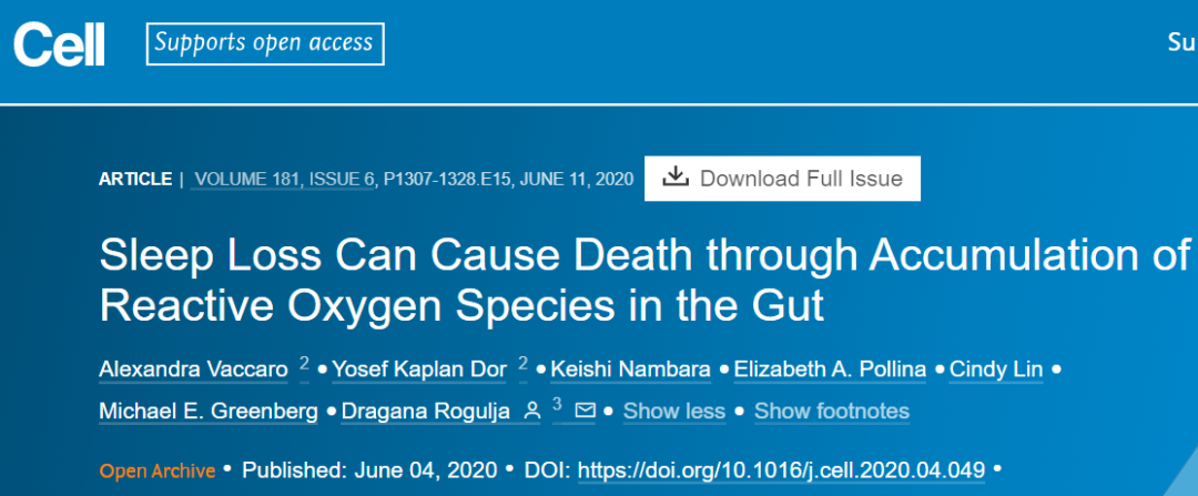 2020年6月4日,美国哈佛医学院Dragana Rogulja团队在Cell 在线发表题为“Sleep Loss Can Cause Death through Accumulation of Reactive Oxygen Species in the Gut”的研究论文,该研究表明睡眠剥夺会导致活性氧(ROS)的积累和随之而来的氧化应激,特别是在肠道中。