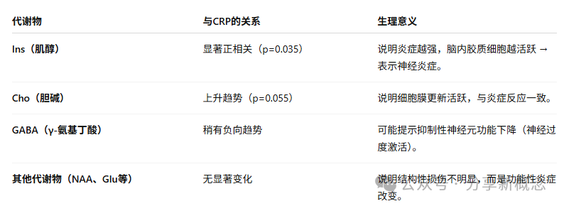 说明炎症越高,脑细胞胶质活化越强,提示脑干存在慢性神经炎症。胆碱(Cho)与 CRP也呈上升趋势(p=0.055)