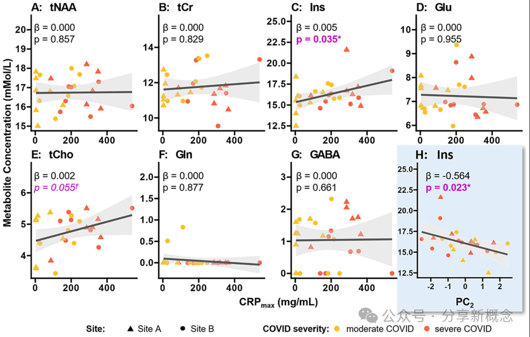 胆碱与膜更新和炎症反应有关,进一步强化炎症与代谢关联。在主成分分析(PC₂)中,Ins的高值与心理健康困扰(焦虑、疲劳)显著相关(p=0.023)表明脑化学变化不仅反映炎症,也与心理状态恶化相关。