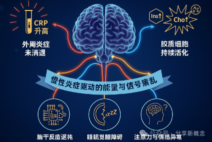这一发现为持续性脑干炎症假说提供关键证据。即便病毒已被清除,部分患者身体的“防御系统”仍未停止战斗,导致系统性炎症(如CRP升高)持续存在。这种“看不见”的低度炎症不断激活脑干中的胶质细胞,进而扰乱大脑的能量代谢、减慢神经传导。
