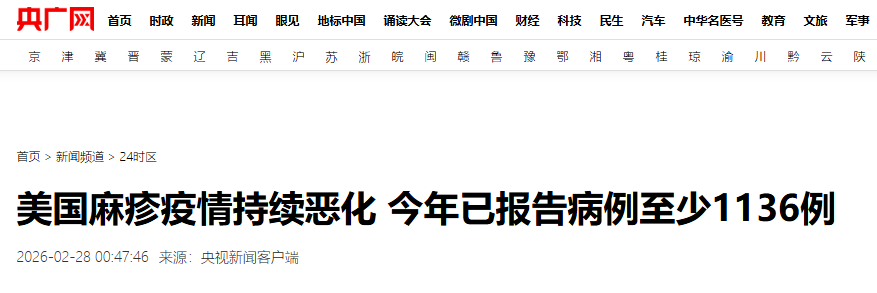 美国疾病控制与预防中心公布数据显示,2026年以来,全美已报告至少1136例麻疹病例,该年仅前八周的病例数已达往年全年水平的六倍,美国正面临又一个创纪录的麻疹高发年(央视新闻,2026)。