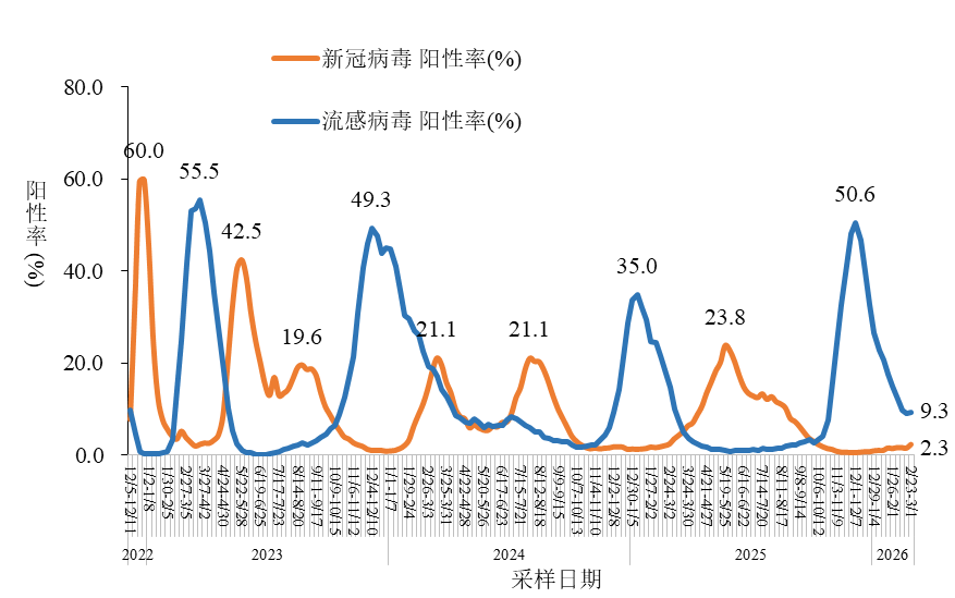 2026年第6周(2026年2月2日-2026年2月8日)至第9周(2026年2月23日-3月1日),流感样病例新冠病毒阳性率呈低位小幅波动增加,分别为1.6%、1.6%、1.5%、2.3%,具体见下图。
